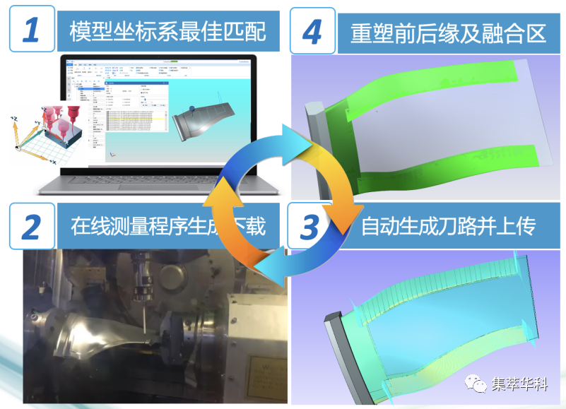 內嵌自適應加工模塊,基于在機測量結果,針對復雜葉片毛坯變形個(gè)性化差異和加工基準找正提供完整解決方案,一次性完成基準找正、模型重塑、前后緣及融合區刀路生成,加工出符合要求的復雜零件。